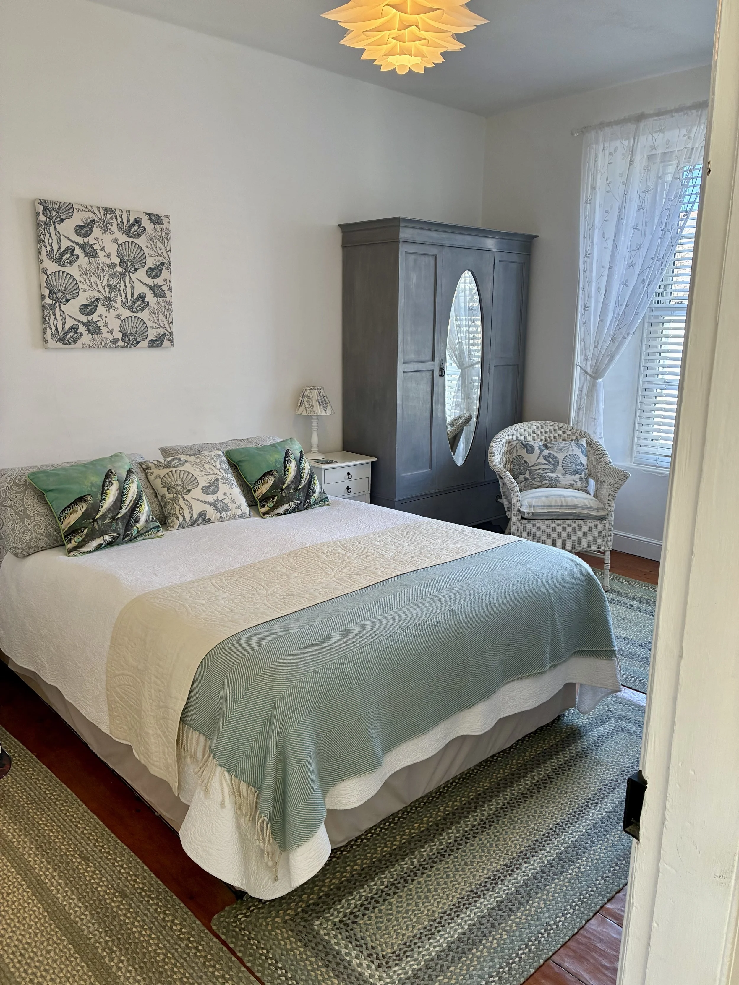 DOUBLE ROOM WITH ENSUITE SHOWER - This tranquil room has white washed stone walls. It is an airy room with white floaty curtains and a white blind overlooking a pretty garden. It has a comfy, king sized bed with sumptuous bedding. The Ensuite shower has complementary shower gel.